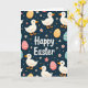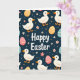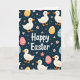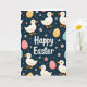 This design shows a deep midnight-blue background with a glowing white message centered near the top, standing out like moonlight against the dark. Across the scene, rounded white bird figures drift in a repeating pattern, each with an orange beak and tiny dot eyes that seem to glance toward one another in friendly, companionable pairs. Between them sit egg-shaped forms in daffodil yellow, blush pink, and soft aquamarine, arranged like little treasures floating through the night. The eggs carry fine stripes, scattered dots, and small abstract marks, giving the surface a gentle, cozy texture. Small blossoms in white and pale pink are sprinkled around, adding a tender, romantic touch, like quiet flowers tucked between close friends 🌷. White and orange specks are scattered like soft twinkles, echoing the beaks and drawing your eye around the layout 🐇. The white text remains centered and luminous, while the birds and decorated eggs are subtly cropped at the edges to create a continuous, all-over pattern. Tiny white petals and orange flecks cluster more densely near a few blossoms, creating little sparkles against the navy field.