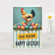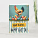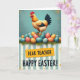 This design shows a tall scene with a proud rooster near the top, posed as if keeping watch over a spring gathering. Its feathers are warm golden-orange with a bright red comb and a deep blue tail, set against a softly textured teal background that feels calm and close. Below the bird sits a rounded pile of speckled eggs in coral, soft gold, and gentle blues and greens, nestled into spiky green grass like a shared nest 🐰. The rooster’s sideways glance and the careful arrangement of the eggs add a tender, companionable tone, like a quiet promise to look out for one another. Across the lower section, wide vertical stripes alternate between teal and cream, giving the layout an orderly, cozy rhythm. A golden banner overlays the stripes, with a smaller dedication line above a larger seasonal greeting in dark, friendly lettering, centered and easy to read 🌷. Tiny orange flecks are scattered across the teal area and near the eggs, like bits of confetti floating around the scene.