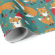 Wrap up Christmas gifts and spread holiday cheer with this cute wrapping paper that features illustrations of adorably festive foxes wearing Santa hats and Christmas wreaths and carrying ornaments and Christmas stockings. The illustrations are set against a dark teal background and accented with holly leaves and berries, tree ornaments and white snowflakes dots.