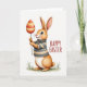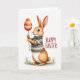 This design shows a friendly long-eared animal standing tall against a soft white background, its dark eyes meeting yours with a tender, affectionate look 🐰. Warm, gentle shading gives its face a slight blush on the cheeks, adding a quiet, cozy closeness. It wears a snug turtleneck sweater with earthy horizontal stripes in muted browns and creams, drawn with smooth outlines and soft texture. In its slim paws, it holds a thin stick like a small offering, as if sharing a sweet moment with a friend. Hanging from the stick is an egg-shaped ornament decorated in warm oranges, reds, and creamy tones, filled with zigzags, dots, and banded patterns that feel festive without being loud 🌷. To the right of the figure, a hand-drawn greeting sits in a warm orange-red color, spaced neatly so it balances the character on the left. A few green blades of grass sit at the creature’s feet, lightly grounding the scene near the bottom edge.
