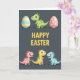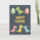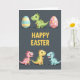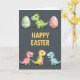 This card features a digital illustration on a deep charcoal background, arranged in three horizontal sections that read like a little scene. At the top, a friendly green dinosaur-like creature with a soft grin and small back spikes stands between two decorated eggs, giving the moment a gentle, companionable feel 🐰. One egg has pale blue and soft yellow horizontal stripes, while the other is pink with white and golden dots. Across the middle, rounded golden-yellow lettering sits centered and announces an Easter greeting, glowing against the dark backdrop. In the bottom section, three small dinosaur-like friends in pastel rose, sunny yellow, and sky blue cluster together, their wide eyes and open smiles angled toward one another like they’re sharing a sweet inside joke 🐇. Each has its own spot pattern and spiky silhouette, and their close spacing suggests a cozy bond without needing any extra props. Subtle shading gives the figures a bit of depth while keeping the overall look smooth and simple. The pink egg shows scattered white and golden polka dots beside the green creature’s curved tail.