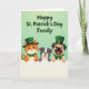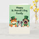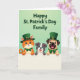 Designed with three friendly cartoon animals peeking up from behind a bright white ledge, this illustration places an orange-striped cat between two dogs, one dark-furred with a white blaze on its face and the other light brown. Their wide, sparkling eyes and big smiles lean toward each other in a way that suggests easy friendship and a touch of sweet affection. Tall emerald green top hats with gold buckles sit on the cat and the right-side dog, and both wear matching green bow ties for a festive look 💚. The background fades from a pale green glow at the top into deeper green tones toward the center, keeping the scene focused on their faces. Across the upper area, a dark green greeting line is centered and stands out clearly against the lighter green backdrop ☘️. Soft shading around their cheeks and ears adds warmth, as if they’re sharing a fun moment together. At the top, the dark green text sits above the trio while the green gradient behind it shifts from light to rich.