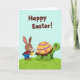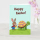 This greeting card shows two friendly animal characters sharing a sweet, cooperative moment in a spring holiday scene 🐰. On the left, a brown long-eared creature in blue overalls and a red shirt leans in with an open-mouthed grin, as if chatting while it works. It holds a small paintbrush over a yellow paint bucket, adding careful details to its companion’s shell with the kind of gentle attention you’d give a close friend. On the right, a green turtle with rosy cheeks stands proudly, angled toward the painter with a tender, pleased look 🐇. The background is a light blue sky above a green grassy strip, keeping the setting simple and airy. Across the top, a seasonal greeting appears in rich brown letters centered above the characters. The turtle’s shell is decorated with wide golden-yellow bands, thin purple stripes, and small pink clover-like shapes.