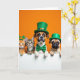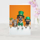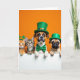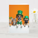 This card shows four furry friends lined up close together behind a bright white ledge, as if they’ve gathered for a shared secret. The background is a strong orange, making the green St. Patrick’s Day accessories stand out 💚. On the left, a ginger tabby and a striped shorthair cat lean in side by side, their curious eyes angled toward the viewer like friendly partners in crime. In the center, a boxer-like dog wears an emerald leprechaun hat and a matching bow tie, holding a gentle, steady look that feels welcoming ☘️. To the right, a pug in a smaller green hat presses forward with its wrinkled brow, adding a serious little note next to the others’ softer expressions. Their paws rest along the top edge of the white surface, creating the sense that the greeting text belongs right there across the blank space in green lettering. Small shamrock shapes sit near the upper left against the orange field, while the hats and bow tie catch the light with a smooth green shine.
