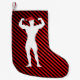 Perfect for the gym loving man in your life. This fun stocking includes a bodybuilder flexing his biceps, wearing a cute Santa hat, with a lovely black and red stripe background.