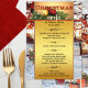 Christmas menu card featuring a whimsical festive design with a Christmas tree in a snow covered landscape with a gold overlay with stylized texts. On the back you can also find wonderful gifts. Beautiful for a family Christmas dinner or a gathering of friends.