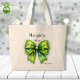 Festive Green Furry Bow-Lights Naughty or Nice Large Tote Bag. This holiday-themed tote bag showcases a fuzzy green bow wrapped in mini lights, adding a whimsical touch. The phrase "Naughty or Nice" is featured, perfect for a playful seasonal vibe. Also below the cute furry bow is a space that can be customized with your name, making it a one-of-a-kind festive accessory or Christmas gift!