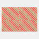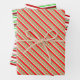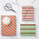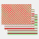These festive Christmas and holidays style wrapping paper sheets designs feature striped patterns having colors like red, white, and green. Wrapping paper sheets like these might be used when wrapping gifts being given to celebrate Christmas.