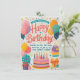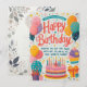The card features a colorful and festive design with the phrase “Happy Birthday” prominently displayed in the center. It is adorned with balloons, cupcakes, a birthday cake with candles, and a gift box. The background includes stars and dots, adding to the celebratory atmosphere.