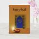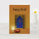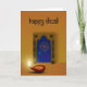 Happy Diwali Illustration: red diya (a cup-shaped indian oil lamp) in front of an indian ornamental window with fireworks outside.