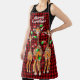 Great color and even though I ordered the kid size, it covers well enough to use during the holidays. I am not a big woman and prefer a shorter apron. I stand 5"6" and the length of the garment goes to mid-thigh. The tie straps fit well at my waist and even though there is no neck strap adjustment, the opening is plenty big enough. I am happy with the size and fit. I am sharing my apron with my 10 year old grandson, too! The color is vibrant and looks good, as shown on the website. The stitching looks strong and reinforced. Photographed is front side and back side of the apron, reinforced straps and coloring. My phone camera may not be the best at showing the details.