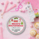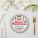 Festive holiday Merry Christmas paper plate with a silver glitter sparkles border and white background. The words "Merry Christmas" are written in a bold red script. The paper plate is decorated with cute little illustrations such as a Christmas tree, red and green candy canes, a gift and holly leaves. At the bottom of the sticker are the words "with love from" and your family name surname.