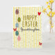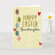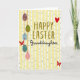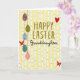 The front design shows a vertical row of five patterned egg shapes on the left, each decorated with stars, dots, and zigzags in deep maroon, olive green, calm blue, and soft pink, hanging from thin beaded strings. On the right, large golden-brown lettering near the top delivers the seasonal greeting, with a smaller line of flowing cursive-style text placed just beneath it for a more intimate tone. Two small red winged birds add a friendly, affectionate feel—one hovering near the hanging eggs as if drawn to them, and the other resting toward the lower right like it’s keeping watch. A bright red heart sits in the upper right, echoing the tender connection suggested by the paired birds. Behind everything, the background alternates pale yellow and white vertical stripes that keep the layout light and springlike 🌷. Tiny scattered blue specks are sprinkled across the stripes, adding texture without crowding the design. The eggs on the left hang straight down in a neat cascade, with the beaded strands clearly visible against the striped backdrop 🐰.