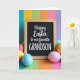 This design shows a framed letter board with a natural wood border and a ribbed black surface, set up like a small stage for an Easter greeting. Centered on the board, white lettering in a flowing calligraphy style spells out the message, standing out crisply against the dark background. Around it, scattered egg-shaped decorations in soft pink, sunny yellow, and cool teal create a lively ring along the foreground and sides, with polka dots and striped patterns that feel like little gifts placed for someone special 🐰. The arrangement reads like a friendly gesture between close companions, as if the board is “speaking” while the surrounding eggs cluster in supportive company. Behind everything, tall vertical bands of aqua, golden yellow, leafy green, orange, and lilac form a rainbow-like backdrop that adds energy without overwhelming the center. Gentle, even lighting smooths the textures and keeps the colors bright and springlike 🌷. The egg shapes sit at different angles, some leaning toward the board, with dots and stripes alternating across their curved surfaces.