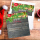 Immerse yourself in the holiday spirit with this enchanting Christmas envelope liner. Set against a rustic wooden backdrop, it features a festive border of twinkling white lights nestled among lush green pine branches. Adorned with red and gold ornaments and pine cones, it exudes a warm, cozy feel. The centerpiece is the cheerful "Happy Holidays" message written in a vibrant red cursive font. This customizable liner is sure to add a touch of charm and joy to your Christmas correspondence.