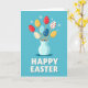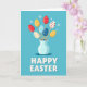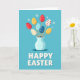 This design shows a light blue vase in the center, dotted with tiny white starbursts, holding a bouquet of tall, egg-shaped decorations that lean toward each other like close friends sharing a secret 🌷. The eggs are colored deep red, sunny yellow, soft blue, rich navy, and creamy white, and each one is covered with neat contrasting dots that add texture without clutter. A smooth teal background fills the scene, making the bouquet stand out while keeping the mood light and springlike 🐰. Near the top, a few small white starbursts are scattered like little glints in the air, giving the space a gentle sparkle. The arrangement spreads upward and outward, and the slight overlaps between shapes create a tender, togetherness feeling in the composition. Along the lower area, rounded white lettering sits clearly against the teal, centered beneath the vase, with the seasonal greeting easy to read. The lighting stays flat and graphic, so the colors and patterns do most of the talking. The final detail is a cluster of small white starbursts floating above the bouquet against the teal field.