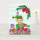 Merry Christmas card with a hand drawn whimsical elf, holiday candies and a pine and Poinsettia border and a cute hand drawn little stocking with a teddy bear sticking out.