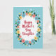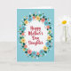 The front design shows a soft powder-blue background with a white oval centered like a spotlight, creating a gentle, affectionate focus ❤️. Inside the oval, the message “Happy Mother’s Day Daughter” sits prominently in flowing crimson lettering, sized large and easy to read. A circular wreath of stylized flowers and deep green leaves wraps around the oval, suggesting a caring embrace between loved ones. The blossoms mix sky blue, sunny yellow, and soft coral petals, arranged evenly so the eye moves around the ring in a calm, friendly rhythm 🌼. Dark green leaves tuck between the flowers to add contrast and a natural, garden-fresh feel. Small white circles, tiny golden stars, and a few dark brown dots are scattered in and around the wreath like light confetti. The overall look stays flat and illustrative, with smooth shapes and tidy edges. Little golden stars appear near the upper-right edge of the wreath, with a few white dots drifting into the blue space beyond.