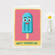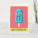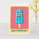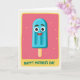 Designed with a cheerful digital illustration, this card features an anthropomorphic frozen treat in bright cerulean blue, standing upright like a friendly little character with wide eyes and a big open smile ❤️. Gently arched dark eyebrows and rounded features give it a tender, welcoming look, like it’s leaning in to share a warm moment. The treat sits on a pale wooden stick, centered against a rich fuchsia pink background that feels festive and affectionate. Scattered across the backdrop are small yellow cross-shaped sparkles and softer starburst shapes, adding a light, celebratory glow 🌼. A sunny yellow inner border frames the scene, with an off-white outer frame that resembles a small photo print. Near the bottom, a wide yellow banner holds the message in teal lettering, placed neatly across the center of the strip. The words “HAPPY MOTHER’S DAY” appear in teal on the yellow banner beneath the blue character, with yellow sparkles floating across the fuchsia background inside the double frame.