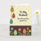 Designed with a balanced layout, the card is divided into two horizontal sections that feel gently connected. The upper area is a soft cream field sprinkled with faint sepia polka dots, and three patterned hanging egg shapes drop in from the top left like little decorations. One egg shows yellow and chocolate stripes, another is maroon with rings of yellow and orange, and the third is teal with thin white curls, creating a sweet, paired-together look as they cluster near one another 🐰. On the upper right, a flowing message is set in a dark brown tone, leaving airy space around it for an intimate, note-like feel. A narrow warm-brown band with a dotted edge separates the bottom portion, where a deeper earthy brown background becomes a garden scene. Coral, blue, and sunny yellow flowers rise on green stems, with two more egg shapes tucked among the leaves as if keeping close like friends—one light green with white swirls and one red with tiny white star marks 🌷. The lower garden is filled with curving leaves, scattered blossoms, and the red egg sitting just to the right of the green one among the stems. End it by sharing Easter sentiments.