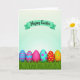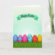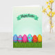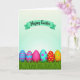 This design shows a row of six decorated egg shapes nestled in thick green grass along the bottom, like a little spring parade where each one seems to lean toward the next in friendly company 🐰. One egg has blue and pink stripes, another shows zigzag chevrons, and a third is a solid bright pink that sits confidently among the patterns. Nearby, an aqua egg is dotted with small pink flower shapes, adding a gentle, affectionate touch to the lineup 🐇. A red round ornament with yellow dots and an orange one with green speckles add extra pops of color beside the eggs. Above them, a curved mint-green banner arcs across a pale background that fades from white into soft aqua, like morning light. Dark, handwritten-style lettering sits centered on the banner, standing out clearly against the mint tone. The eggs have a smooth, glossy look while the grass below is textured with fine blades and shaded clumps.