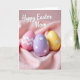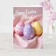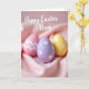 This design shows three decorated egg shapes nestled closely together in the folds of a soft, light pink cloth, like friends leaning in for a quiet photo 🐰. One egg is pale pink with crisp white chevron stripes, giving it a tidy, cozy look. Another is light lavender with scattered small white stars, and the third is sunny yellow with matching star accents, creating a sweet, shared rhythm across the trio 🌷. The fabric gathers around them in gentle waves, and the close spacing makes the scene feel affectionate, as if the eggs are keeping each other company. Soft, diffused lighting smooths the egg surfaces while bringing out the cloth’s tender texture and warm shadows. Near the top, a flowing, handwritten-style greeting appears in white, centered above the eggs and easy to spot against the pink background. The white lettering sits above the trio, while the pink cloth forms rounded folds around the eggs and fades softly toward the edges.