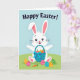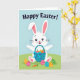 This card features a cheerful, long-eared bunny with fluffy white fur, pink inner ears, and soft pink paw pads, sitting on a bright green patch of grass with an open, welcoming posture 🐰. Its wide eyes and rosy cheeks give it a sweet, friendly look, like it’s happily sharing a small spring surprise with someone close. The bunny holds a teal, woven-style basket in both paws, angled forward as if offering it to a friend. Inside the basket are patterned eggs in a mix of lively colors along with an orange root vegetable tucked among them. Around the bunny’s feet, several decorated eggs in fuchsia, golden orange, blue, and green are scattered like a shared little treasure hunt, with one extra orange root vegetable nearby 🐇. The background fades from sky blue at the top into green at the bottom, keeping the scene simple and airy. Near the top, a short holiday greeting appears in dark lettering, centered above the bunny against the blue sky. The teal basket sits in the middle foreground, with colorful eggs dotting the grass in small clusters.