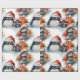 Colorful Christmas wrapping paper showcases adorable penguins in Santa hats surrounded by vibrant gifts and festive greenery. Perfect for adding joy to holiday presents.