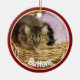 Pet photo Christmas ornament done in a round shape ceramic, with graphics red framed custom photo, on the front with white text. The back is done in red, green and white with graphic text reading Merry Christmas and a custom year your personalize. Add you pet's picture, name and the year for a great holiday ornament to remember your pet.