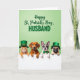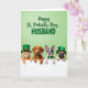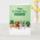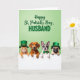 Designed with a soft gradient background shifting through shades of green, the card sets a cozy St. Patrick’s Day scene that feels friendly and a little romantic in its gentle mood 💚. Along the bottom edge, four pets line up close together—an orange tabby cat, a reddish-brown puppy, a brindle-and-white dog, and a fawn-colored pug—leaning their paws over a bright white ledge as if they’re sharing the moment with you. Three of them wear tall green hats with small golden buckles, and the brindle-and-white dog adds a green bow tie that makes the group look neatly dressed for a special date or a sweet get-together. Their faces are expressive and inviting, with wide eyes and soft, eager looks that suggest affection and companionship rather than mischief. Near the top, a holiday greeting appears in large green cursive-style lettering, with an additional line beneath it in thicker green letters that reads like a short dedication. The text sits centered above the animals, leaving plenty of open green space around it so the message stands out clearly ☘️. Warm fur tones contrast with the cool greens, and the hats’ gold accents add small points of shine. The white ledge runs straight across the lower portion, with all four sets of paws resting on it in a tidy row.