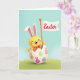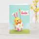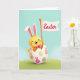 This card shows a sunny yellow, human-like bunny character with soft pink inner ears, rosy cheeks, and a fuchsia bow tie, smiling with closed eyes as if sharing a private joke with the viewer 🐰. It pops up from a cracked, creamy white eggshell, with its little arms lifted in an inviting, friendly pose. Across the front of the shell are simple orange and pink animal-head silhouettes and a mix of egg-shaped patterns with thin stripes and tiny dots, giving the scene a sweet, springtime rhythm 🌷. The bunny holds an orange pole topped with a crisp white banner that leans slightly to one side like it’s caught by a light breeze. The word “Easter” sits centered on the banner in rosy pink lettering, standing out clearly against the white. Behind the main figure, the background fades softly from an aquamarine sky into a green field, like a calm outdoor meadow. Gentle lighting adds smooth highlights along the bunny’s ears and the curved rim of the eggshell. Small patterned ovals in orange, pink, and pale tones scatter across the shell beneath the banner.