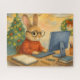 Watercolor illustration of a holiday-themed scene with a cute rabbit wearing round glasses and a red sweater, working on a computer surrounded by study supplies and twinkling Christmas lights. Perfect gift for anyone who loves whimsical animals during Christmas.