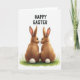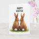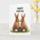 Designed with two rabbit-like animals facing each other on a small patch of bright green grass, the scene focuses on their russet-brown fur and fluffy white tails 🐇. Their noses nearly meet, and their dark, wide eyes hold a tender, unhurried gaze that suggests close friendship or romance. Fine whiskers and a soft, painterly coat texture add detail, while a faint pink blush warms the inside of their long ears. Above them, a short Easter message appears in dark, thick lettering, centered near the top of the card. The text stands out clearly against a plain white background, leaving lots of open space around the figures. Subtle shading and gentle highlights give the animals a rounded look without crowding the simple layout 🌷. The white backdrop stays uncluttered, with the green grass forming a small base beneath their feet and their tails bright against the fur.