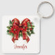 Personalized keychain with a festive Christmas bow in red and gold. Surrounded by poinsettia flowers, pine and Christmas decorations.