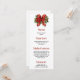Menu card with a festive Christmas bow in red and gold. Surrounded by poinsettia flowers, pine and Christmas decorations.