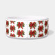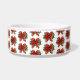 Personalized pet bowl with a festive Christmas bow in red and gold. Surrounded by poinsettia flowers, pine and Christmas decorations.