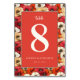 This wedding table card features a vibrant red background framed by a lively floral border of poppies in shades of deep red, orange, and cream. The design includes a large white number "8" centered within the rectangle, with elegant cursive script above and clean sans-serif typography below for a balanced look. The cheerful and festive mood is enhanced by the bright colors and detailed floral motifs, making it perfect for adding a touch of celebration to your special day.