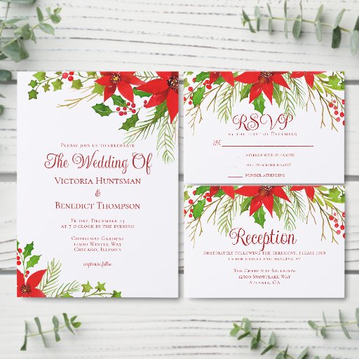 This classic red Christmas wedding reception card features bright poinsettia flowers with holly berries and green leaves at the top. A festive and bright design in red script for a holiday event. Bright and cheerful enclosure cards.
