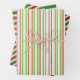 These fun, festive designs feature Christmas and holidays style striped patterns having colors like green, white, and red. Festive wrapping paper sheets like these might be fun to use when wrapping presents being given when celebrating Christmas.