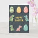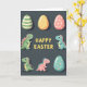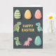 This card features a tall layout on a deep charcoal background, with a cluster of decorative eggs above a group of small, friendly reptile-like creatures that lean toward one another as if sharing a sweet inside joke 🐰. Three eggs sit near the top: one with sage-green stripes, one warm yellow with dotted texture, and one blush pink with tiny white dots. Centered in the middle is a festive greeting in glowing yellow letters, standing out clearly against the dark backdrop. Beneath the text, four little creatures in pastel green, light blue, and gentle pink have contrasting spines and soft, expressive faces, and a couple of them angle their heads close together in a tender, companionable way. Gentle lighting adds soft shadows and a slight shine that makes the eggs feel smooth and glossy 🌷. A teal egg with shiny decorative accents anchors the lower right, balancing the scene. The far-left creature shows a wide grin with small teeth, while the dotted pink egg above it looks neatly patterned and slightly glossy.