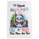 A whimsical representation of a snowy character wearing a Santa hat, surrounded by colorful presents and a beautifully decorated Christmas tree. Festive stamps embellish the background, celebrating the spirit of the holiday season with joy and cheer.