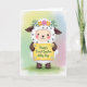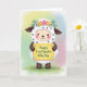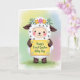 This design shows a cheerful, stylized sheep with a soft white, cloud-like coat sprinkled with tiny charcoal-gray speckles, giving it a gentle, cozy look. Its round face has rosy cheeks, small black eyes, and a small smile that feels like a friendly glance shared with someone close. The ears and limbs are a deeper brown, adding warm contrast while keeping the character simple and sweet 🐰. A flower wreath rests on its head, mixing soft pink and bright orange blooms with light green leaves, like a spring crown made for a special day 🌷. In front, the sheep holds a golden rectangular sign, centered as the main focus of the scene. Small blue stars sit near the corners of the sign, and a seasonal greeting appears across the middle in green, flowing lettering. Behind everything, the background fades from pale green near the bottom into soft yellow, light blue, and faint pink higher up, like a lightly painted sky.