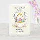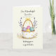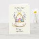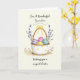 This card shows a soft watercolor scene with a white basket covered in small dots and a rustic brown handle, tied with a sunny yellow bow 🌷. Inside the basket sit four decorated eggs, arranged close together like friends leaning in for a photo: one lavender with white stripes, one pink with a zigzag, one yellow with white speckles, and one teal with pale horizontal bands 🐰. The lighting looks gently washed, giving the colors a tender, close-to-the-heart feel without any sharp edges. Behind the basket, thin sprigs of tiny purple blossoms rise up and curve slightly, like they’re reaching toward each other. Below, a light earthy brown patch anchors the scene, and small pink flowers with slim green stems grow up around it. A short Easter greeting appears near the top in a flowing dark gray font, leaving plenty of open space around the illustration. The edges are bordered by a thin, soft gray line that frames the basket and flowers.