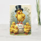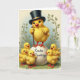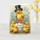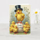 This design shows a plump yellow bird standing atop a large white egg, dressed in a black top hat with a thin golden band and holding a slim walking stick. Its bright blue eyes and rosy cheeks pair with an open beak, as if it’s calling out to friends with a fond, welcoming look 🐰. Nearby, five smaller yellow birds gather close, leaning in toward one another like a tight-knit group sharing a sweet moment 🐇. The background fades from creamy beige at the top into a soft sky blue, giving the scene a gentle springtime air. Thin green vines curl along the edges like a natural frame, hinting at new growth. Across the front of the egg, the words “Easter Greetings” sit centered in flowing dark lettering that stands out against the white surface 🌷. At the bottom, rich green grass is dotted with tiny blue and yellow wildflowers beneath the birds and egg.