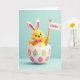 This card shows a plump, bright yellow chick-like character wearing tall rabbit ears with pale pink inner details, giving it a sweet, friendly look 🐰. It sits snugly inside a cracked open eggshell, as if popping out to greet someone with a warm, welcoming grin and rosy cheeks. A magenta bow tie at its neck adds a cute, dressed-up touch, like it’s showing up for a springtime date or a close friend’s celebration. One wing is lifted to hold a small rectangular flag on an orange pole, and the word “Easter” appears on the flag in flowing lettering. The eggshell is soft white and decorated with scattered pastel ovals and dots in pink, aqua, and orange, including a few simple long-eared head shapes tucked into the pattern 🌷. Everything is lit with gentle highlights and soft shadows that make the character and shell look rounded and smooth. Behind it all is a calm robin’s-egg blue background with no other objects, keeping the focus on the chick, the patterned shell, and the little flag.