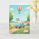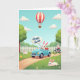 This greeting card shows a spring scene under a wide, clear blue sky, where several stylized white rabbits share a day out together 🐰. In the center, one rabbit drives a light blue vintage-style convertible, glancing ahead with a cheerful, inviting posture that feels like it’s making room for a friend. Near the top area, a rounded speech bubble holds the words “Happy Easter” in a dark, flowing handwritten style, standing out clearly against the pale background. To the right, another rabbit pedals a bicycle along a winding tan dirt path, angled slightly toward the group as if keeping pace with them 🐇. In the grassy foreground, two rabbits lounge close together among small pink and yellow flowers, their relaxed poses suggesting an easy closeness. Above them, a red-and-white striped hot air balloon floats with a tiny rabbit in the basket, while a small yellow chick peeks from the grass nearby 🌷. A white picket fence stretches across the mid-ground, with puffy white clouds scattered overhead and bright green hills rolling behind the path.