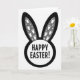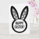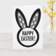 This card features a simple spring bunny motif, with a deep black background framing a white circle at the bottom and two tall ear shapes rising evenly above it 🐇. Each ear has a soft gray inner panel sprinkled with small white paw prints in different sizes, like two friends leaving a trail side by side. The strong contrast between black, white, and gray keeps the design crisp while giving the bunny a gentle, affectionate presence 🐰. Centered inside the white circle, a short seasonal greeting appears in thick sans-serif letters, set in black for easy reading. The text sits low on the card, while the ears and their footprint pattern draw the eye upward, creating a calm, balanced layout. The scattered prints feel like a shared stroll through early spring, adding a quiet hint of closeness without adding extra clutter. Two long black ears with gray centers stand above the white circle, and the tiny white footprints dot the gray panels in a neat, drifting pattern.