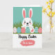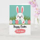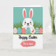 Designed with a cheerful spring scene, the card features a white furry bunny with long ears and rosy cheeks peeking from behind a row of six decorated eggs 🐰. Its dot eyes and tiny nose give it a sweet, friendly look, and its little paws rest gently on the egg tops as if it’s leaning in close. The upper half shows a teal-blue sky above stylized green grass, keeping the setting simple and bright. Beneath the illustration, a wide white area holds the greeting “Happy Easter” in black lettering, centered and easy to read. Just below that, a coral-pink paint-like underline carries the smaller words “He is risen” in dark text. The eggs are patterned in soft pastel blues, greens, pinks, and white, with details like small flowers, polka dots, zigzags, and a tiny bunny silhouette 🐇. The bunny’s shy peek over the eggs feels like a gentle hello meant for someone close. A thin coral-pink stroke sits under the main greeting, stretching horizontally across the white space.
