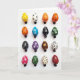 This design shows sixteen decorated egg shapes set in a neat four-by-four grid on a bright white background, giving the layout a tidy, gallery-like look. Each egg rests on a small matte black round stand, and the repeated bases make the group feel connected, like friends gathered close. The colors range from sunny yellow and orange to cool blue and green, with deep purple, brown, black, and white accents that make the patterns easy to notice. Several eggs carry polka dots in high-contrast pairings, such as white dots on red or black, and multicolor dots scattered over orange. Others show simple flower-like bursts and star motifs, including white marks on black, yellow marks on brown, and fine black marks on creamy white, creating little visual “conversations” from one egg to the next. Near the top, a short Easter greeting appears in a soft gray, centered and spaced so it doesn’t crowd the designs, with a smaller line beneath it in pale yellow and a tiny 🌷. The lighting is even and gentle, so you can see the slight texture on the eggs and the smooth finish of the black stands, and a small 🐰 icon sits near the lower right edge. The final row includes a purple egg with tiny white dots beside a green egg with a simple white floral burst, both aligned squarely above their black bases.