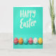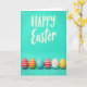 This design shows a smooth aqua background that sets a fresh spring scene, with a gentle, airy glow across the surface 🌷. Across the upper portion, a large creamy-white seasonal greeting stretches wide, its slightly textured letters standing out softly against the cool color behind it. The message sits centered near the top, leaving plenty of open space that feels calm and inviting, like a quiet pause before a shared celebration. Along the lower third, six decorated egg shapes line up in a neat row, close enough to feel like a friendly group gathered side by side 🐰. Their patterns mix stripes and polka dots in red, yellow, turquoise, and white, creating little contrasts that feel like a cheerful back-and-forth between close friends. Light falls from above, adding faint shadows under each egg so they look gently grounded rather than flat. The row includes a turquoise egg with dots, a white egg with stripes, and a bright yellow egg with spots, all evenly spaced beneath the creamy-white text.